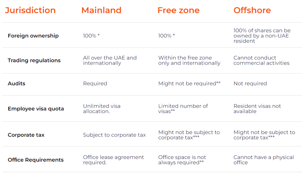 There are two common setups available to foreigners when starting a business in the UAE — the Free Zone and the Mainland. Mainland Businesses can be established anywhere and trade directly with the local market. Free zone businesses can trade from designated zones and require a local agent to trade directly in the UAE.